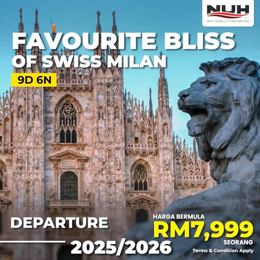 Pengembaraan anda bermula seawal di KLIA, berkumpul 4 jam sebelum penerbangan. Setelah penerbangan jauh merentasi benua, anda akan tiba di Lapangan Terbang Milan Malpensa, Itali.Di sinilah, udara Eropah menyambut anda dengan segarnya.